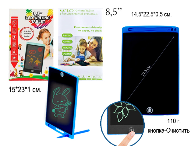 Размер упаковки: 9,5 х 12 х 3,5 см400 руб. 782.78 руб. - Планшет для рисования арт. 8501BB/8501C/8501J-805 На батар. 8,5 в кор._•~+=×Планшет для рисования арт. 8501BB/8501C/8501J-805 На батар. 8,5 в кор._•~+=Идеально подходит для школы, офиса, дома, дачи и в дороге. Вы можете создавать рисунки, чертить, писать или делать подсчеты, оставлять сообщения..